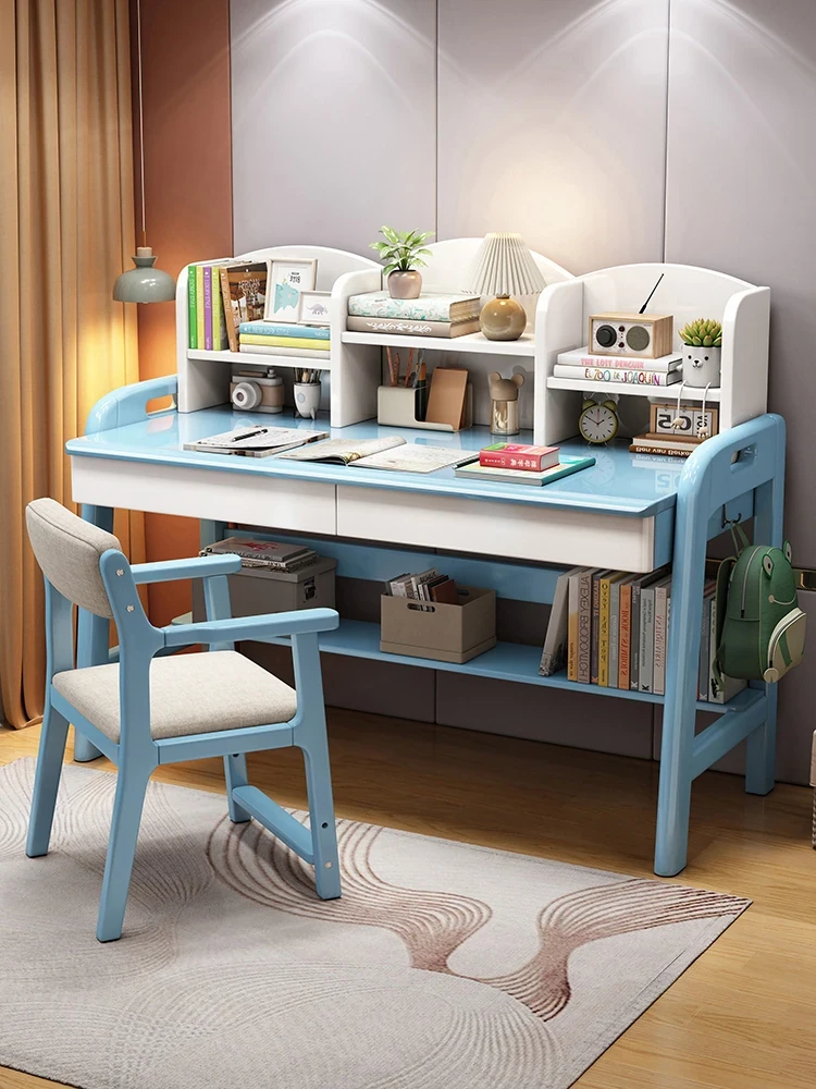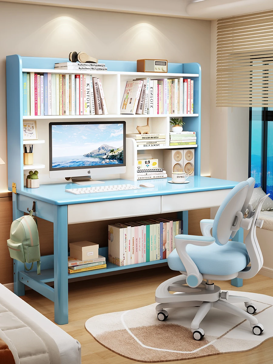 高さ調節可能な子供用学習デスク&本棚セット - 多機能天然木製デスク、中学生までの成長をサポート!