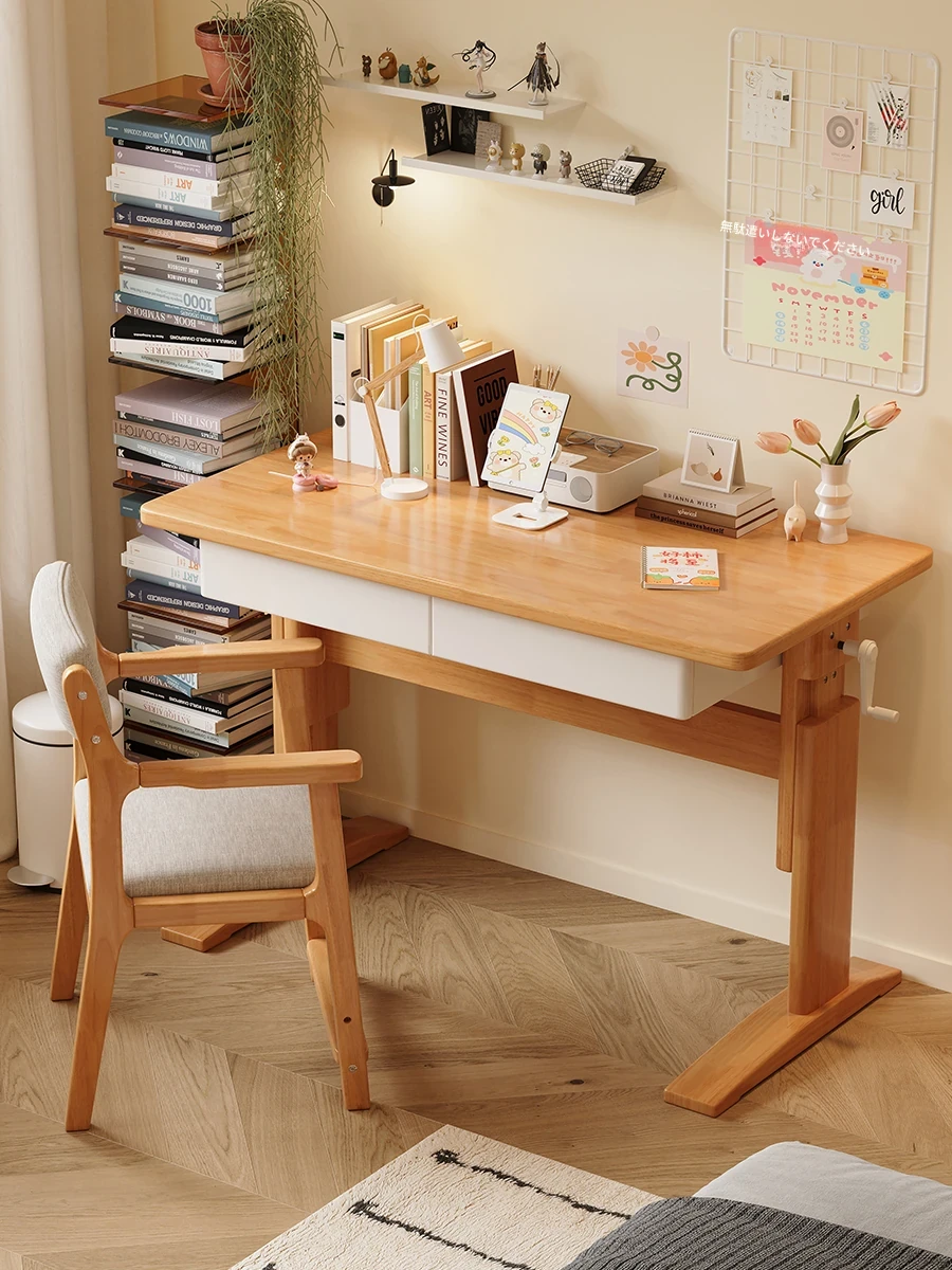 天然木材の手動昇降デスク - 学生と家庭用に最適なシンプルデザイン学習机、ベッドルームにもぴったり!子ども向け小学生セットで快適な勉強環境を実現。