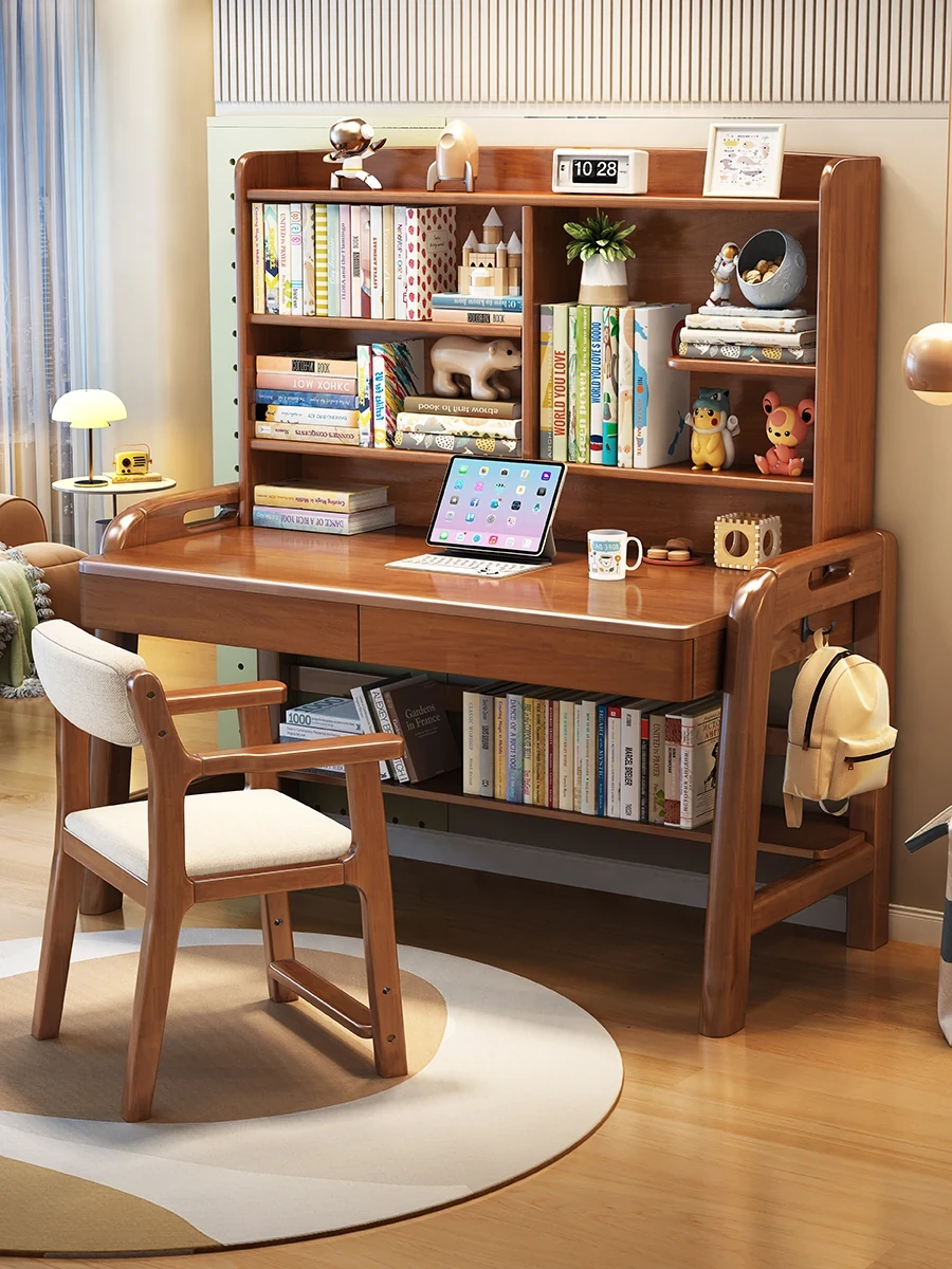 【丈夫で安全】天然木製デスク&シェルフ一体型学習机 - 子供用可調節式書斎机、中学生にも最適な家庭用ワークステーション