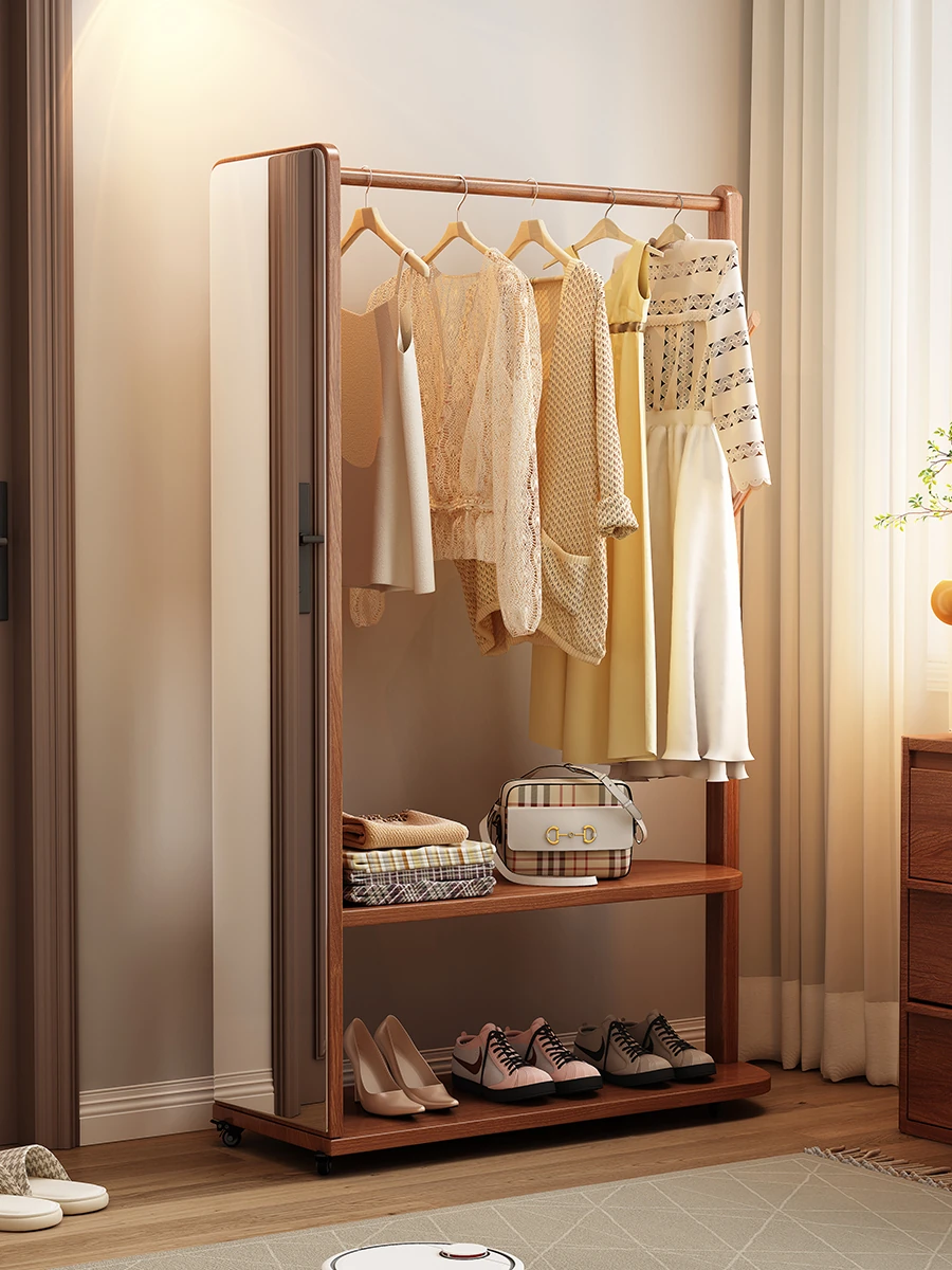 Multi-Functional Solid Wood Coat Rack with Dressing Mirror and Shoe Cabinet – Floor-Standing Storage Solution for Bedroom, Perfect for Organizing Clothes and Accessories