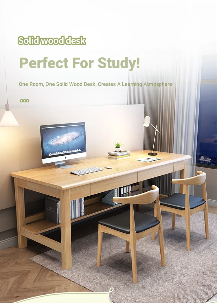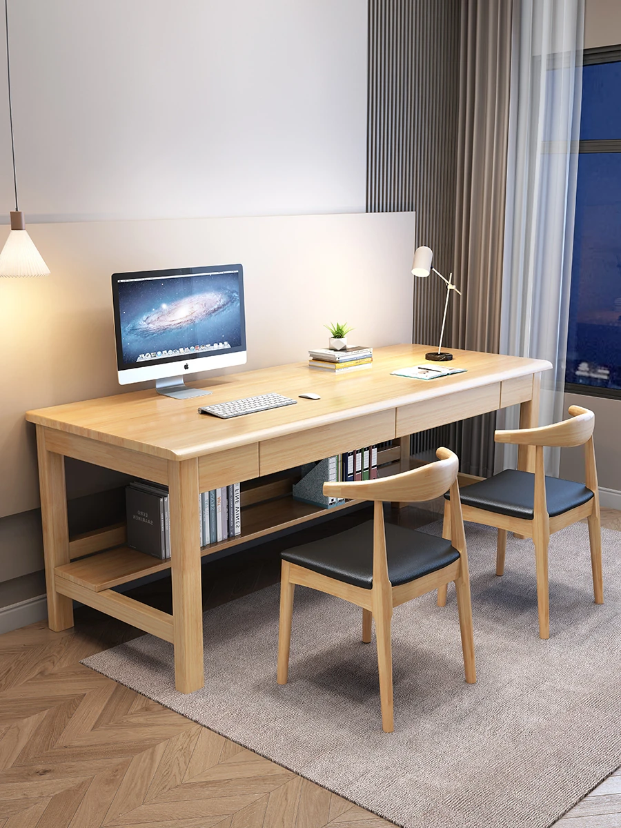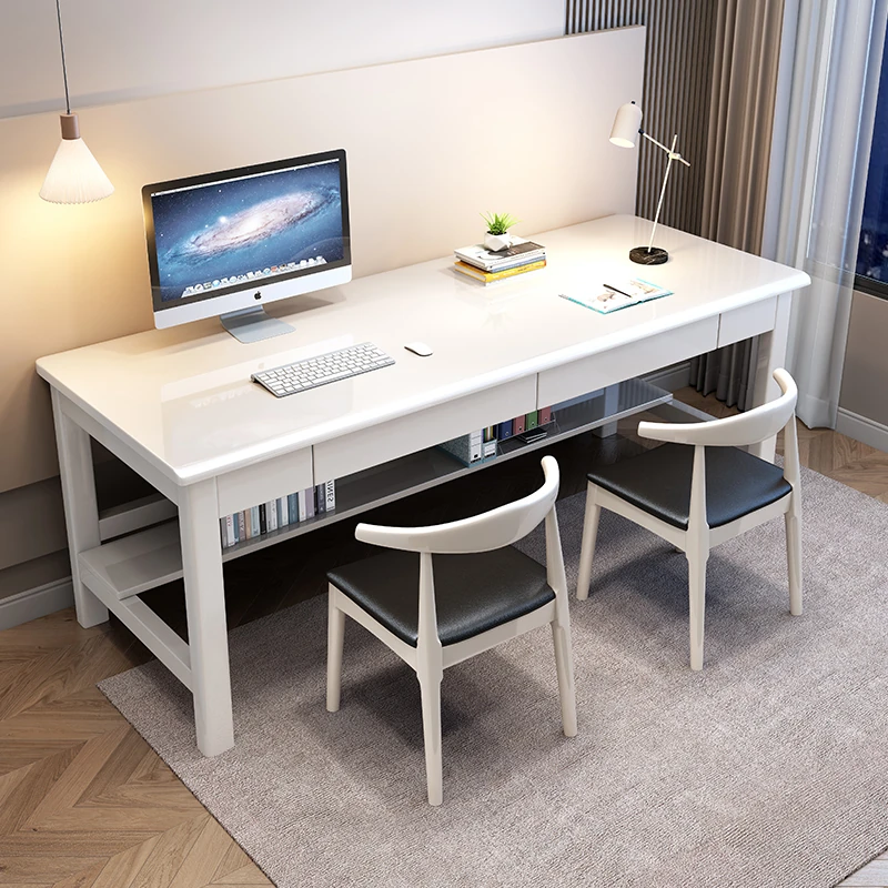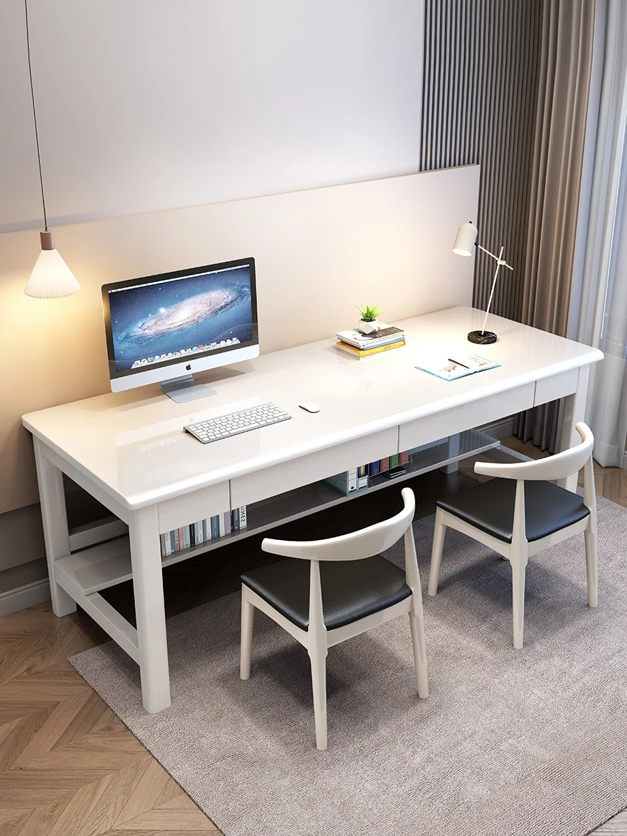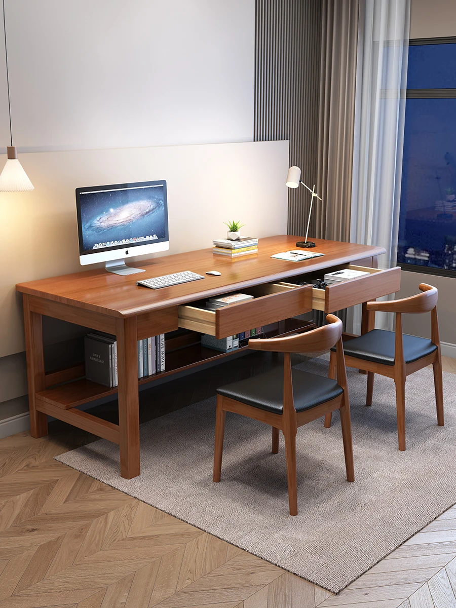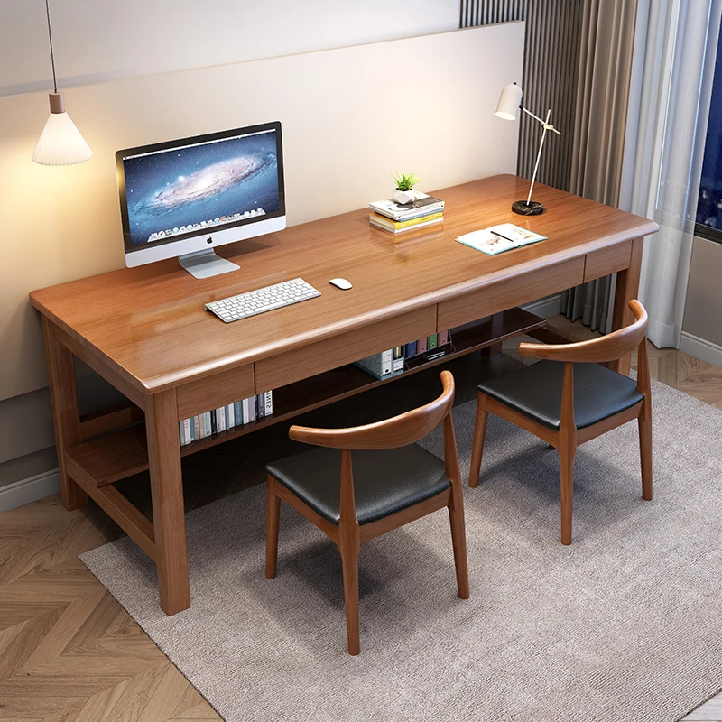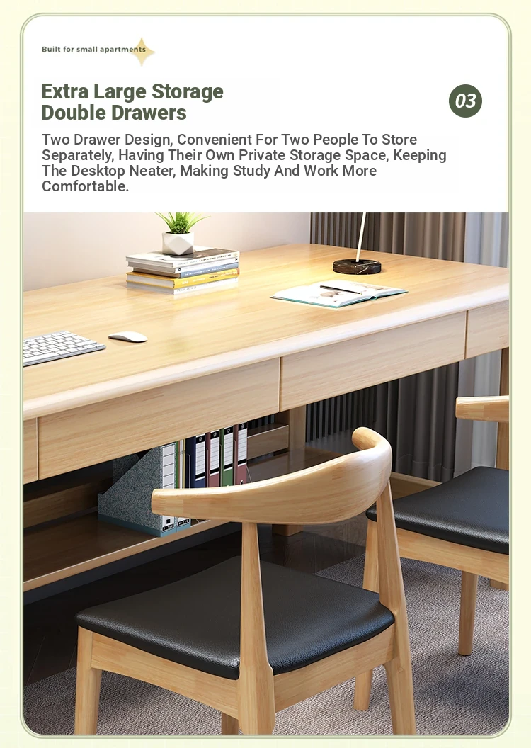 "Elegant Solid Wood Double Work Desk - Space-Saving Wall-Mounted Design for Home Office, Bedroom, or Study - Minimalist Computer Desk with Seating for Comfortable Studying and Work"