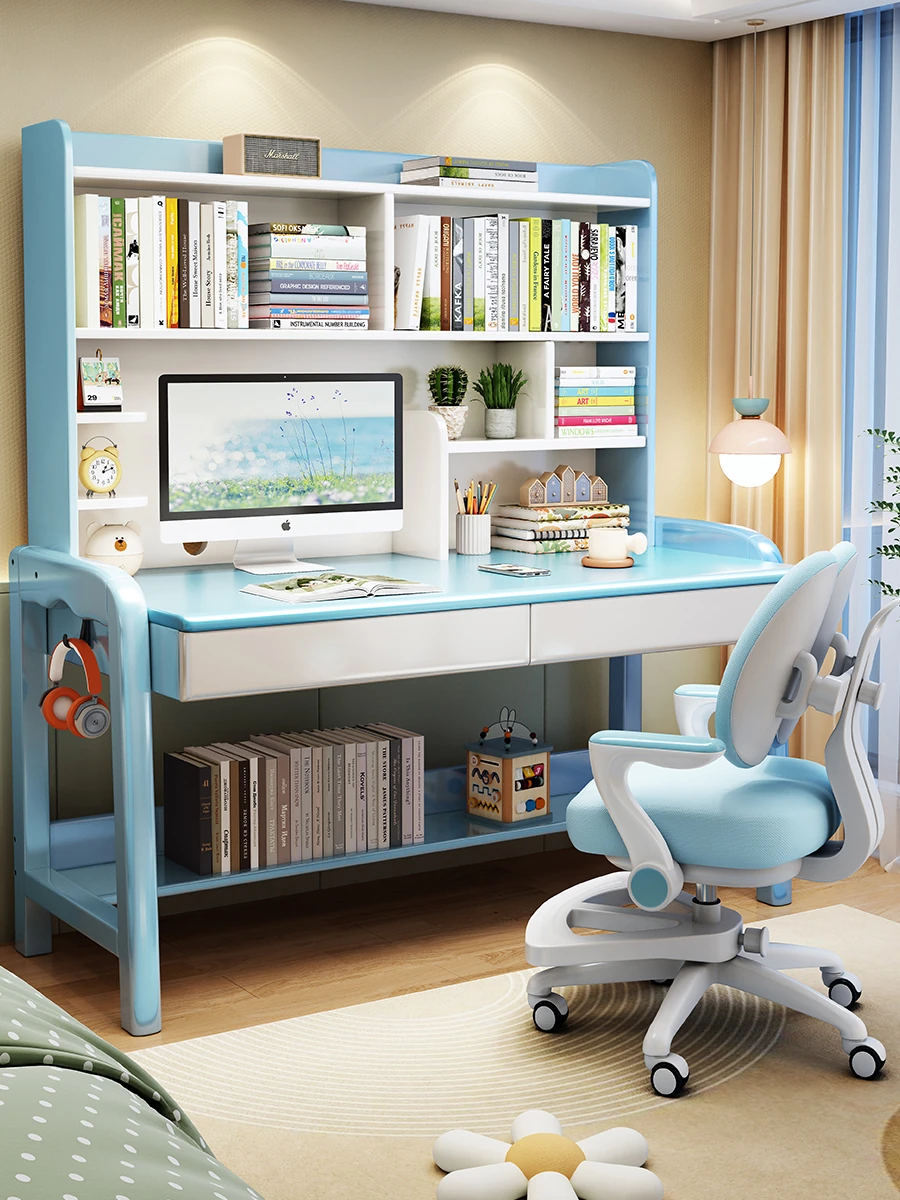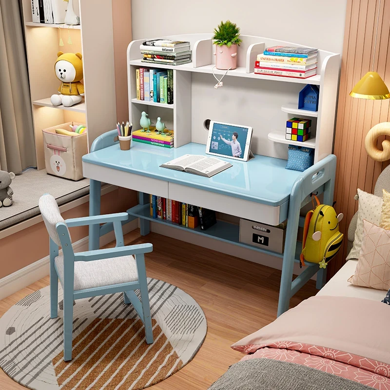 Rainbow# table + posture correction chair [log + Blue]](Adjustable lifting table top)